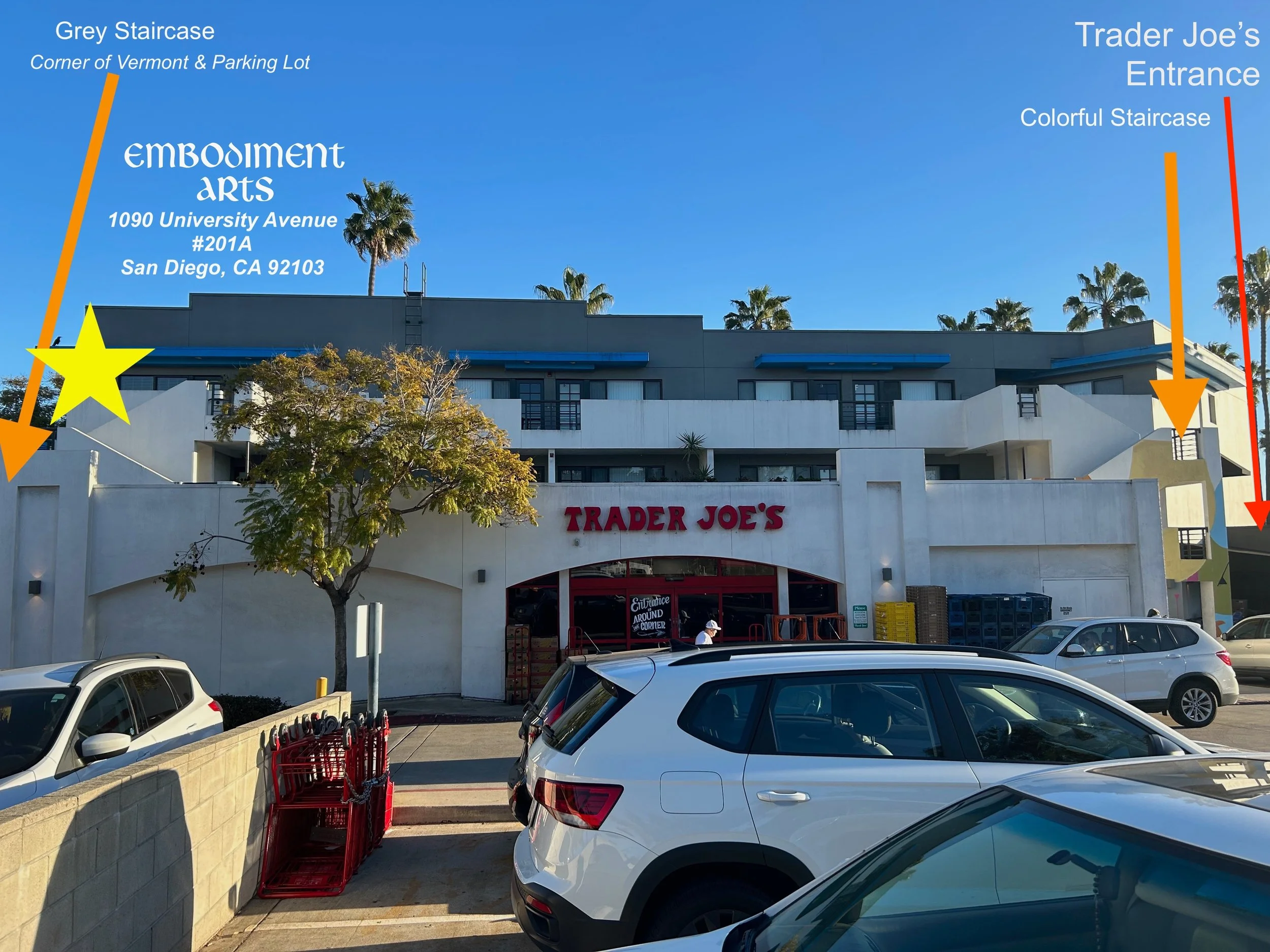 STAIRS: are found behind Trader Joes's. Above is the view from the parking lot behind Trader Joe's. The Lofts are accessable from both the gray and the colorful staircase.